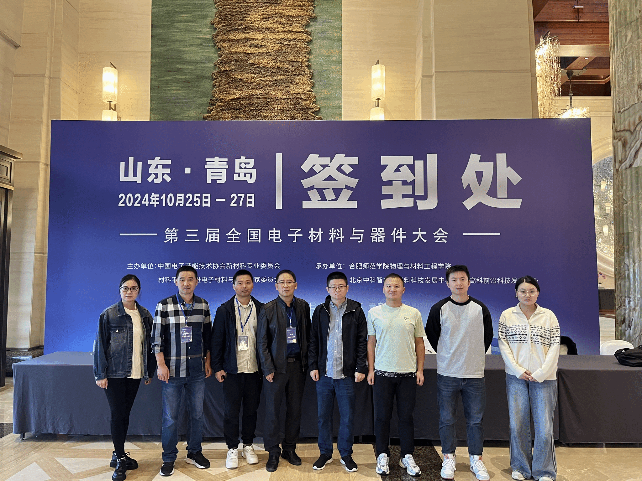 2024年10月25至28日,第三届全国电子材料与器件大会在山东省青岛市顺利召开。作为领域内重要的专业性学术会议,本届全国电子材料与器件大会由中国电子节能技术协会新材料专业委员会和先进电子材料与器件专家委员会单位主办,js6668金沙登录入口js6668金沙登录入口、北京中科智材新材料科技发展中心和北京高科前沿科技发展中心联合承办。js6668金沙登录入口院长訾振发教授带队,一行八人参加了本次会议。