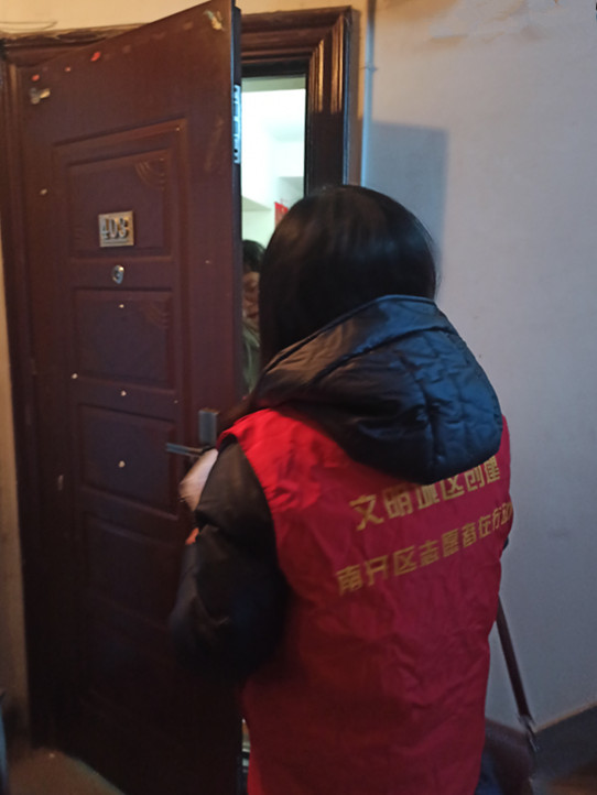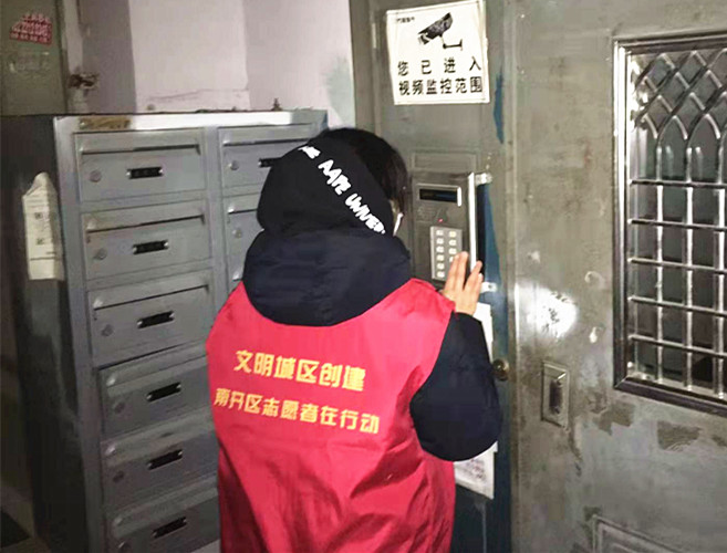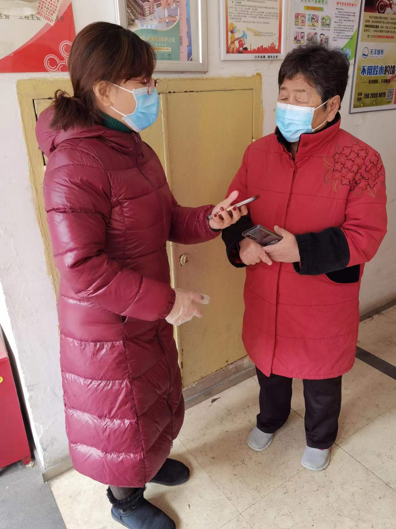 张晓丹,中共党员,新闻与传播教研室教师,在南开区体育中心街道阳光壹佰国际新城社区开展人员和楼宇数据信息采集核对工作。