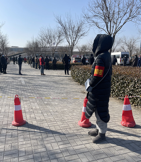 李金佳,舞蹈教研室教师,在静海区华康街道湖岸栖庭社区开展核酸检测现场人员引导工作。