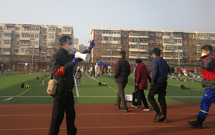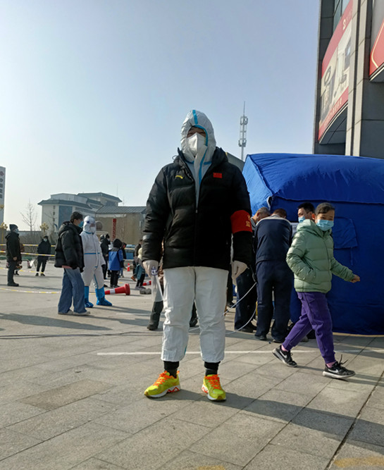 王晓楠,武术教研室教师,在南开区体育中心街龙滨园社区协助开展全员核酸检测现场扫码登记、秩序维护工作。