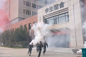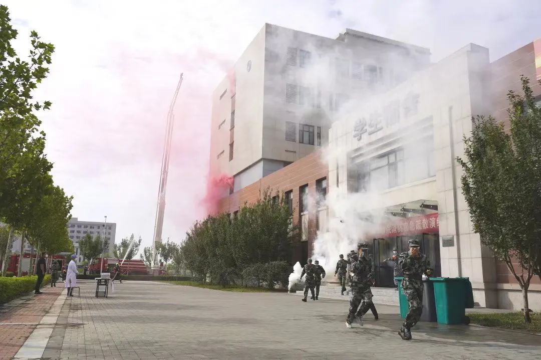 在疏散演练环节,突发事件的演练场景为烟雾弹模拟的火灾场景。接到学生火灾报警后,校消防控制室立即启动1-9号宿舍楼消防报警系统。同学们用湿毛巾捂住口鼻,在疏散引导员和军训教官的指引下迅速有序撤出宿舍楼,并按照既定的应急疏散方案、路线,撤离至指定地点。党委安全工作部配合团泊西中队消防员迅速扑灭模拟火源,让师生身临其境地感受火灾场景。
