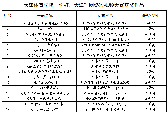 日前,由天津市委宣传部、市委网信办、海河传媒中心主办,津云新媒体承办的“你好,天津”网络短视频大赛评选结果揭晓,我校17部作品分获一二三等奖,其中一等奖3项,二等奖1项,三等奖13项。