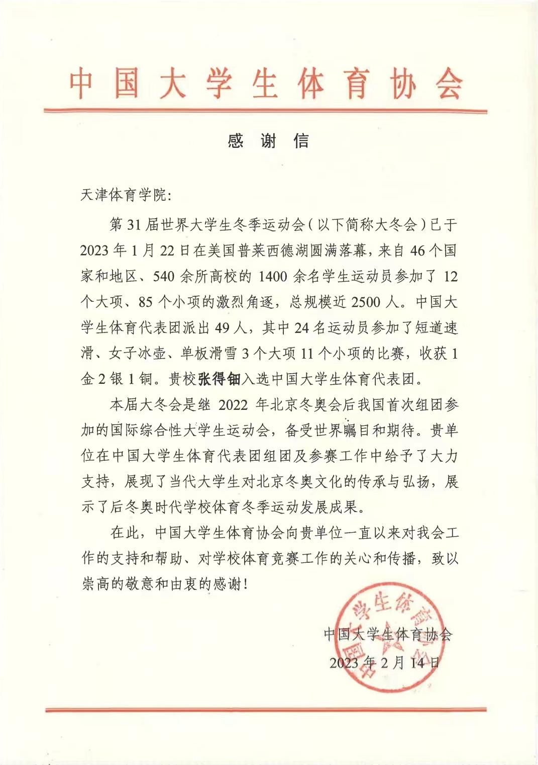近日,中国大学生体育协会给我校发来感谢信,感谢我校培养的竞技运动学院2021级学生张得钿入选中国大学生体育代表团。