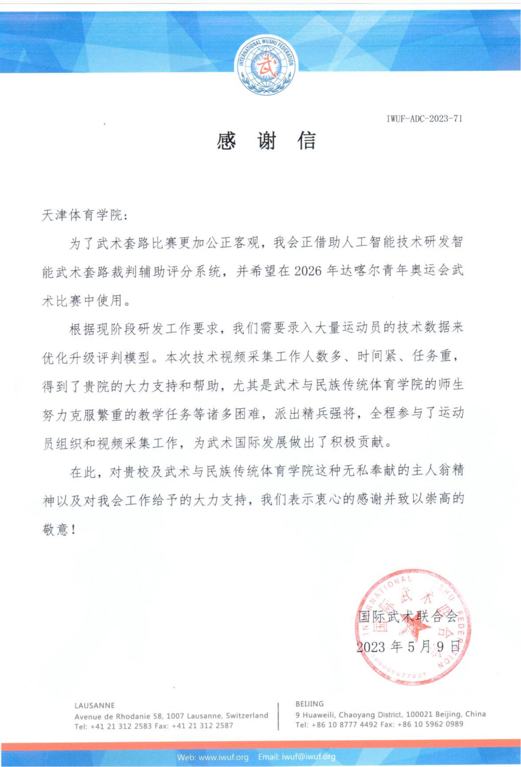 近日,国际武术联合会给我校发来感谢信,对我校武术与民族传统体育学院参与智能武术套路裁判辅助评分系统相关建设工作表示感谢。