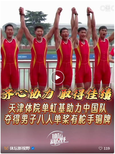 赛艇赛场,我校学子单虹基亮相男子八人单桨有舵手决赛,他携手队友以5分42.27秒为中国队拼得铜牌。