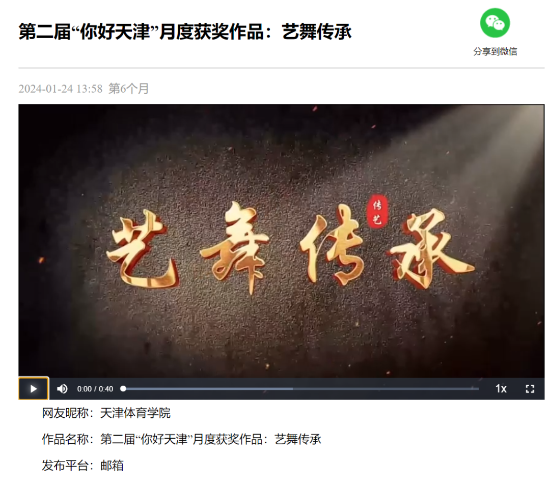 日前,第二届“你好,天津”网络短视频大赛第六个月赛评选结果揭晓,我校新媒体作品《艺舞传承》入围月度优秀作品。