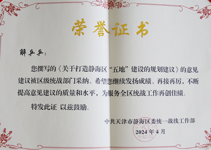 会议通报了2023年各单位智库成员撰写的意见建议情况。我校傅涛老师撰写的《关于推动环团泊湖文化旅游体育产业发展的建议》、解乒乒老师撰写的《关于打造静海区“五地”建设的规划建议》被区级统战部门采纳,并被授予荣誉证书。