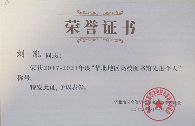 会上,华北地区高等学校图书馆协作委员会对在高校图书馆工作中做出突出贡献的个人和集体进行了表彰,我校图书馆荣获2017-2021年度“华北地区高等学校图书资料先进集体”荣誉称号,刘胤荣获“华北地区高等学校图书馆先进个人”荣誉称号。