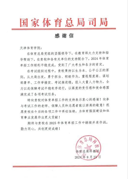 近日,国家体育总局科教司发来感谢信,对我校圆满完成2024年体育单招工作表示肯定和感谢。