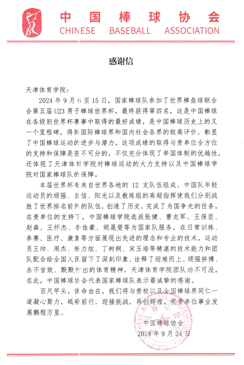 近日,中国棒球协会向我校发来感谢信,对我校师生团队助力国家棒球队参加世界棒垒球联合会第五届U23男子棒球世界杯并取得第四名的优异成绩表示感谢。