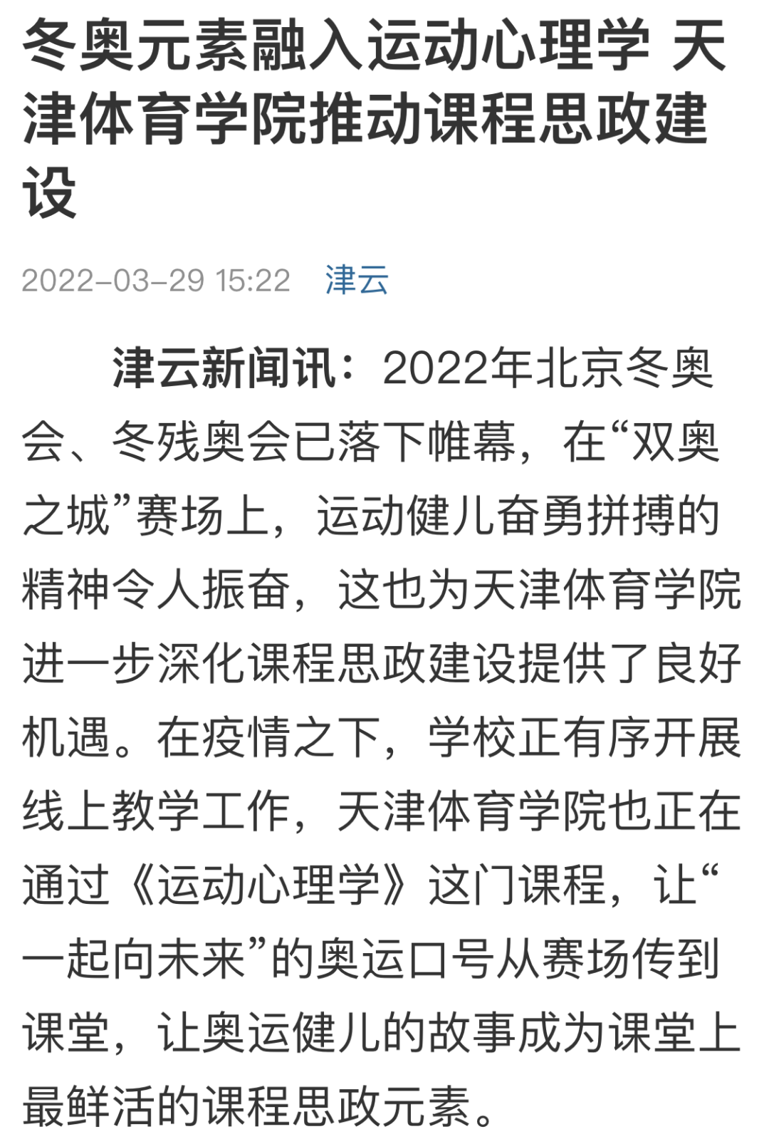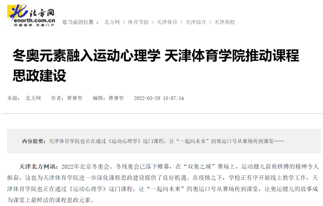 2022年3月29日,北方网、津云以“冬奥元素融入运动心理学 1683168诸侯快讯官网推动课程思政建设”为题,对我校进行报道,现全文转载。