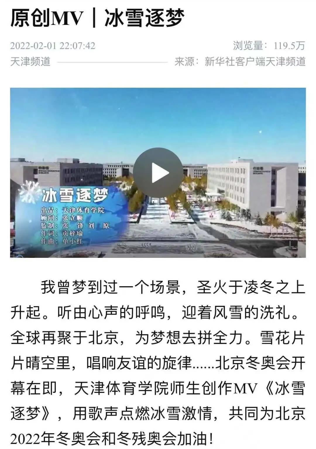 2月1日,新华社客户端播发我校师生创作的MV《冰雪逐梦》,截至目前,浏览量近120万人次。