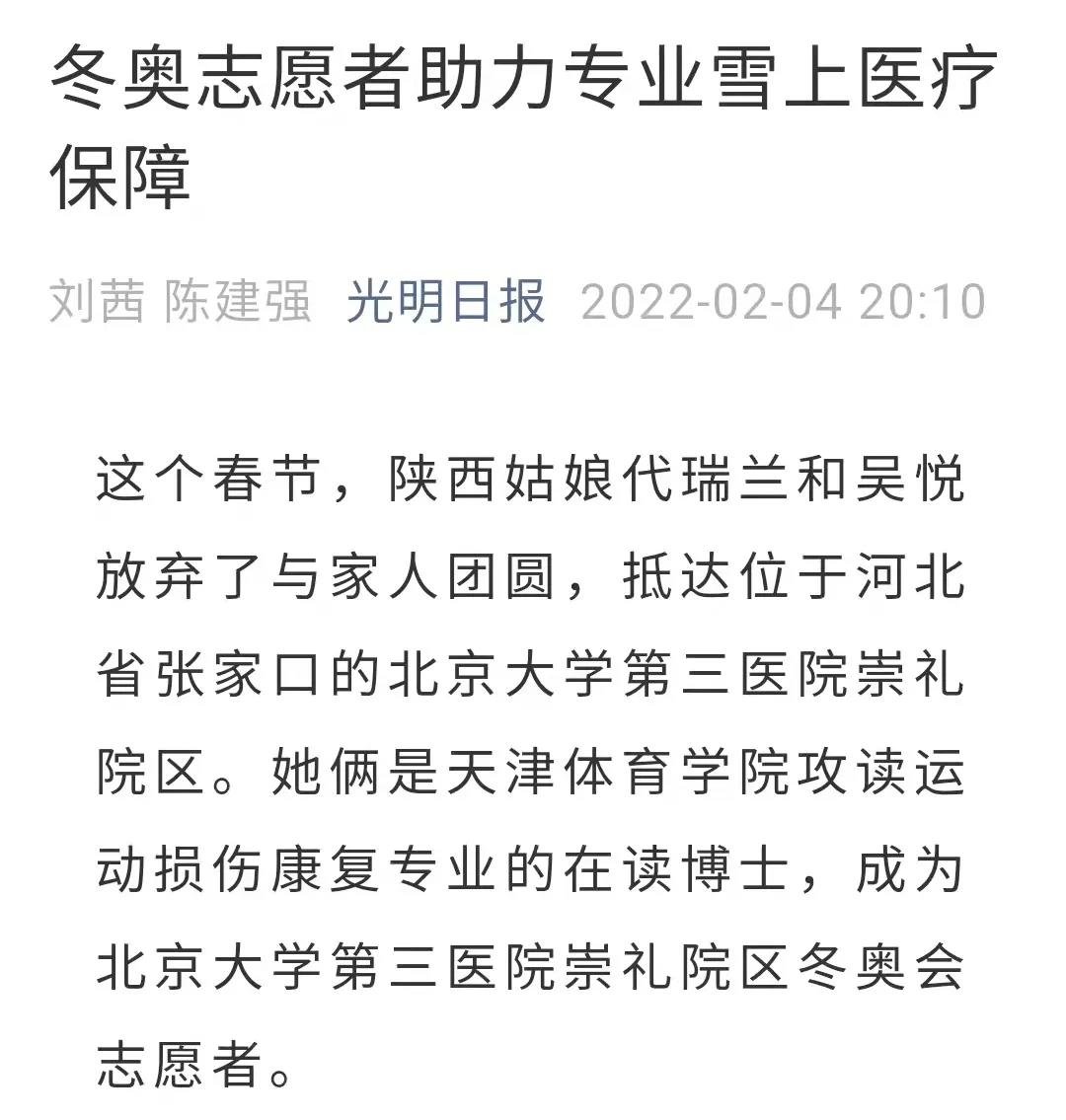 这个春节,陕西姑娘代瑞兰和吴悦放弃了与家人团圆,抵达位于河北省张家口的北京大学第三医院崇礼院区。她俩是1683168诸侯快讯官网攻读运动损伤康复专业的在读博士,成为北京大学第三医院崇礼院区冬奥会志愿者。