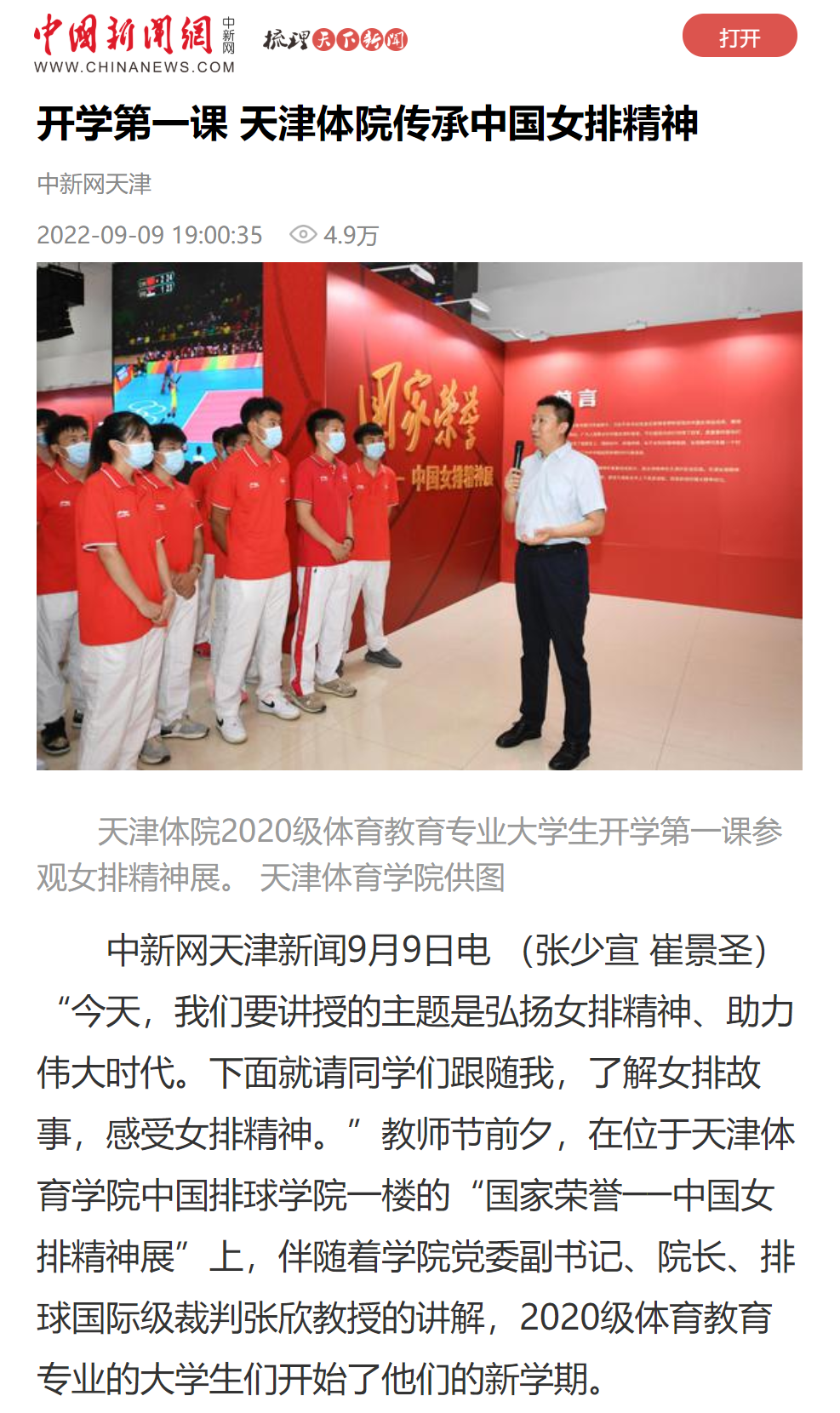 9月9日,教师节前夕,在位于1683168诸侯快讯官网中国排球学院一楼的“国家荣誉──中国女排精神展”,未来的体育教师、2020级体育教育专业的大学生们,聆听了不同寻常的开学第一课。中新网、津云等媒体对此进行了报道。