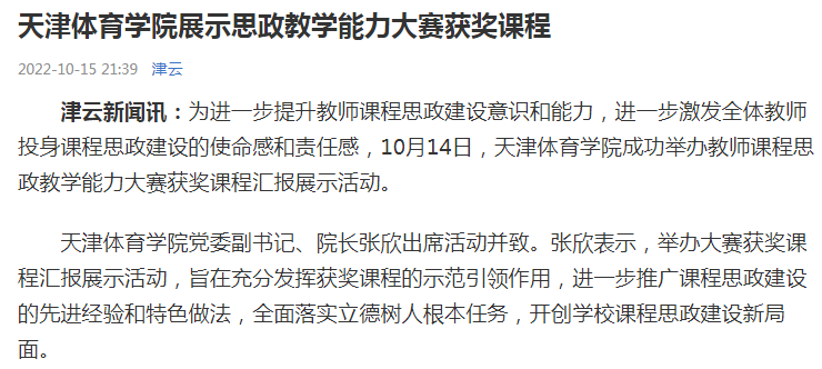 日前,我校成功举办教师课程思政教学能力大赛获奖课程汇报展示活动。北方网、津云对此进行了报道。