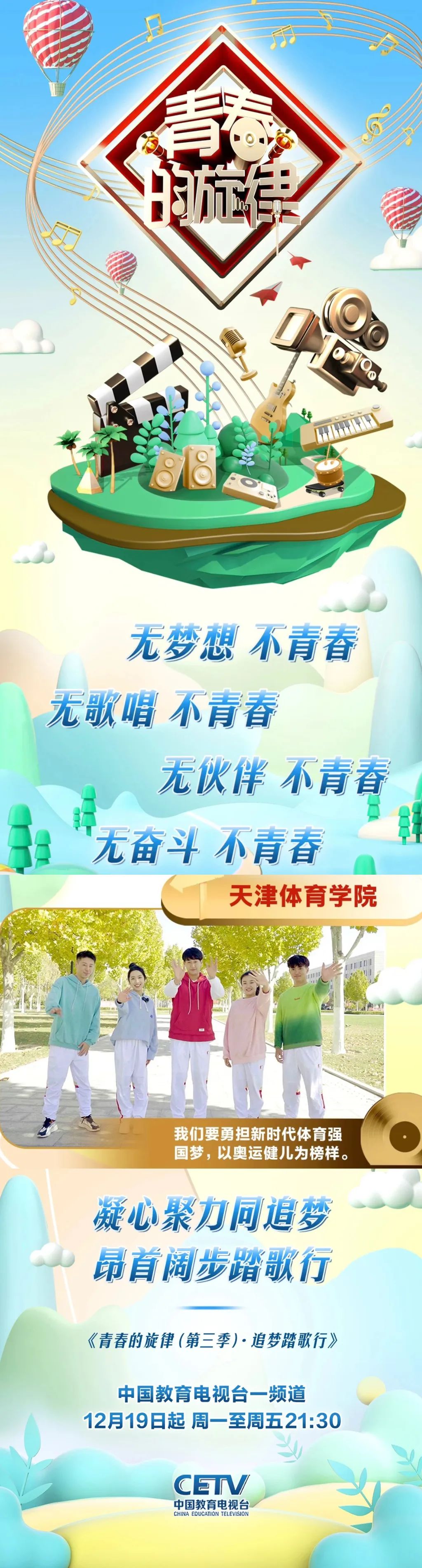 2022年12月19日起周一至周五21:30,音乐思政节目《青春的旋律(第三季)·追梦踏歌行》在中国教育电视台一频道播出。受中国教育电视台邀请,我校师生于今年11月参与节目的策划拍摄录制,全面贯彻落实党的二十大精神,引领青年学子奋发进取共筑中国梦,勇担新时代体育强国梦。