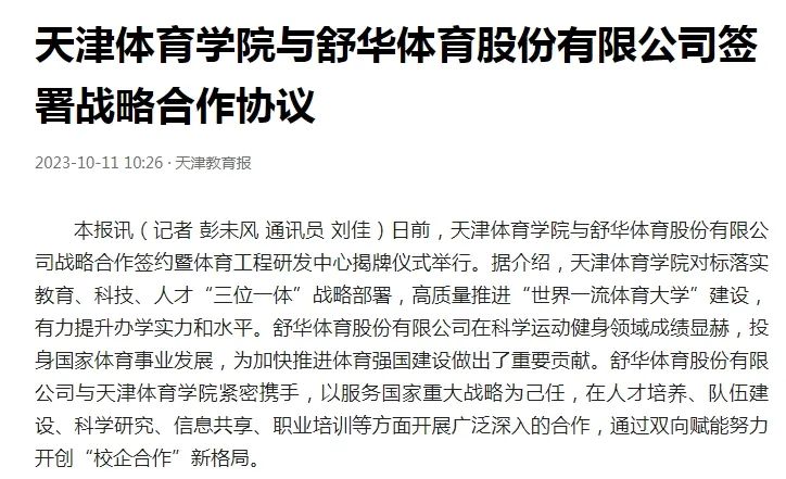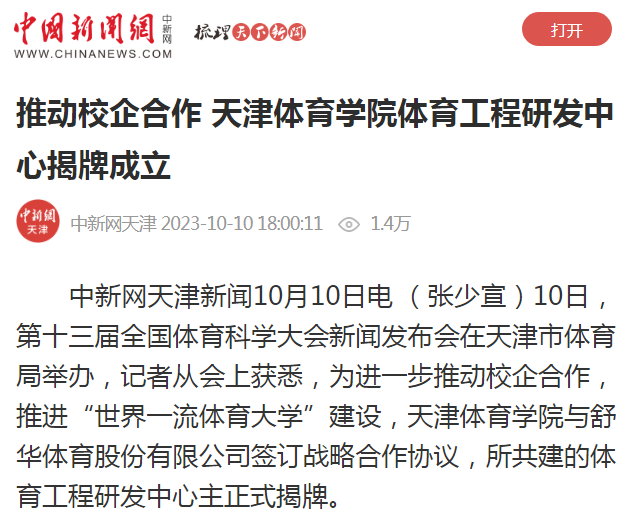 2023年10月10日,1683168诸侯快讯官网与舒华体育股份有限公司战略合作签约暨体育工程研发中心揭牌仪式举行。中国新闻网、天津教育报新媒体等对此进行了报道。