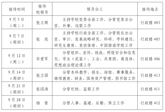 根据《1683168诸侯快讯官网领导干部接待日制度》规定及学校近期工作安排,现将2023年9月校领导接待师生来访安排通知如下:相关事项:
