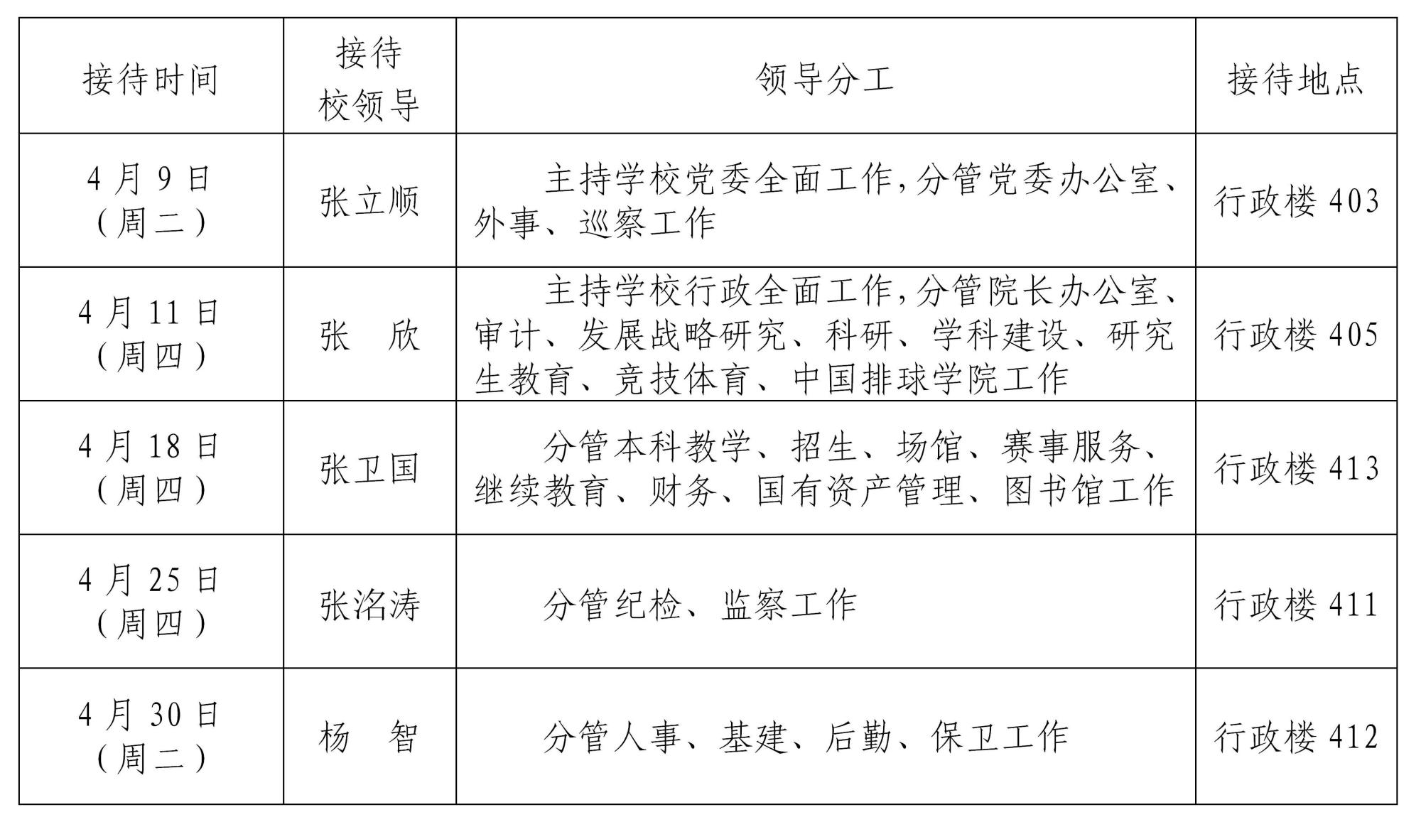 根据《1683168诸侯快讯官网领导干部接待日制度》规定及学校近期工作安排,现将2024年4月校领导接待师生来访安排通知如下: