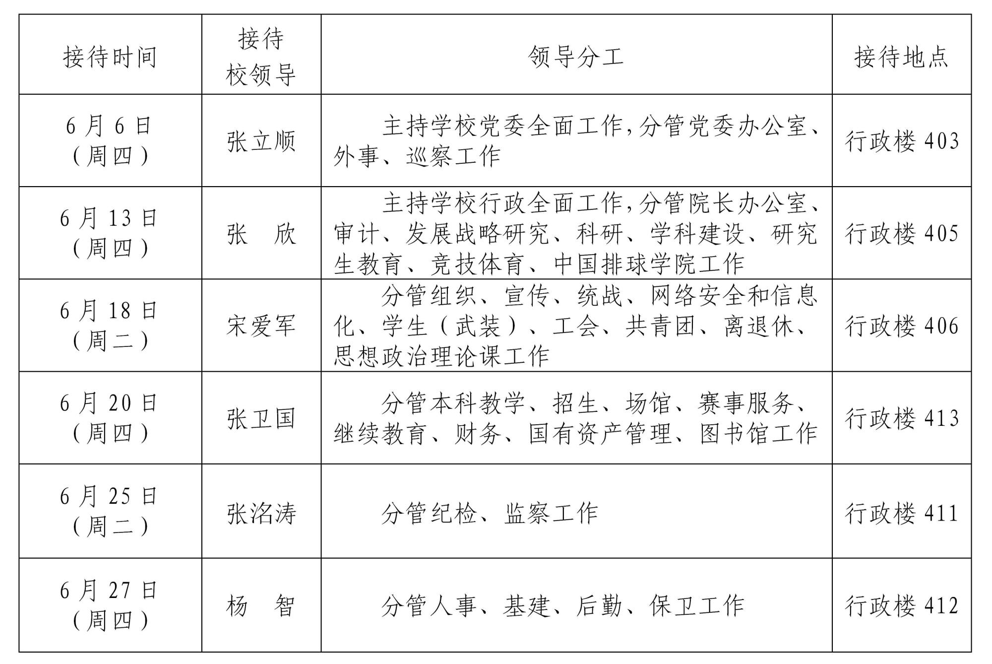 根据《1683168诸侯快讯官网领导干部接待日制度》规定及学校近期工作安排,现将2024年6月校领导接待师生来访安排通知如下: