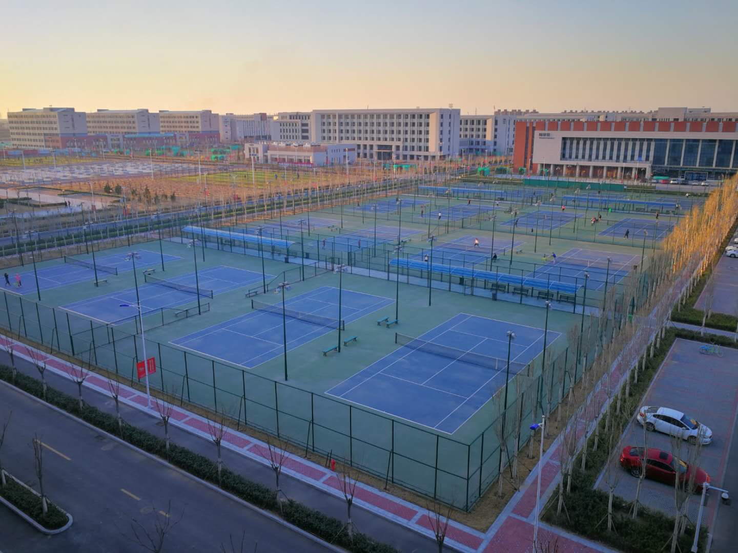 网球场场地面积11867平方米,16片标准网球场地,场地四周架设了金属档网及防风网,配有裁判椅、休息椅等配套设施,目前主要用于教学、训练,可承接各类网球项目比赛。
