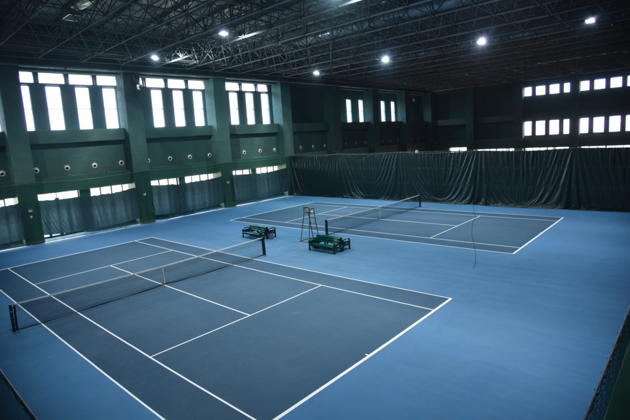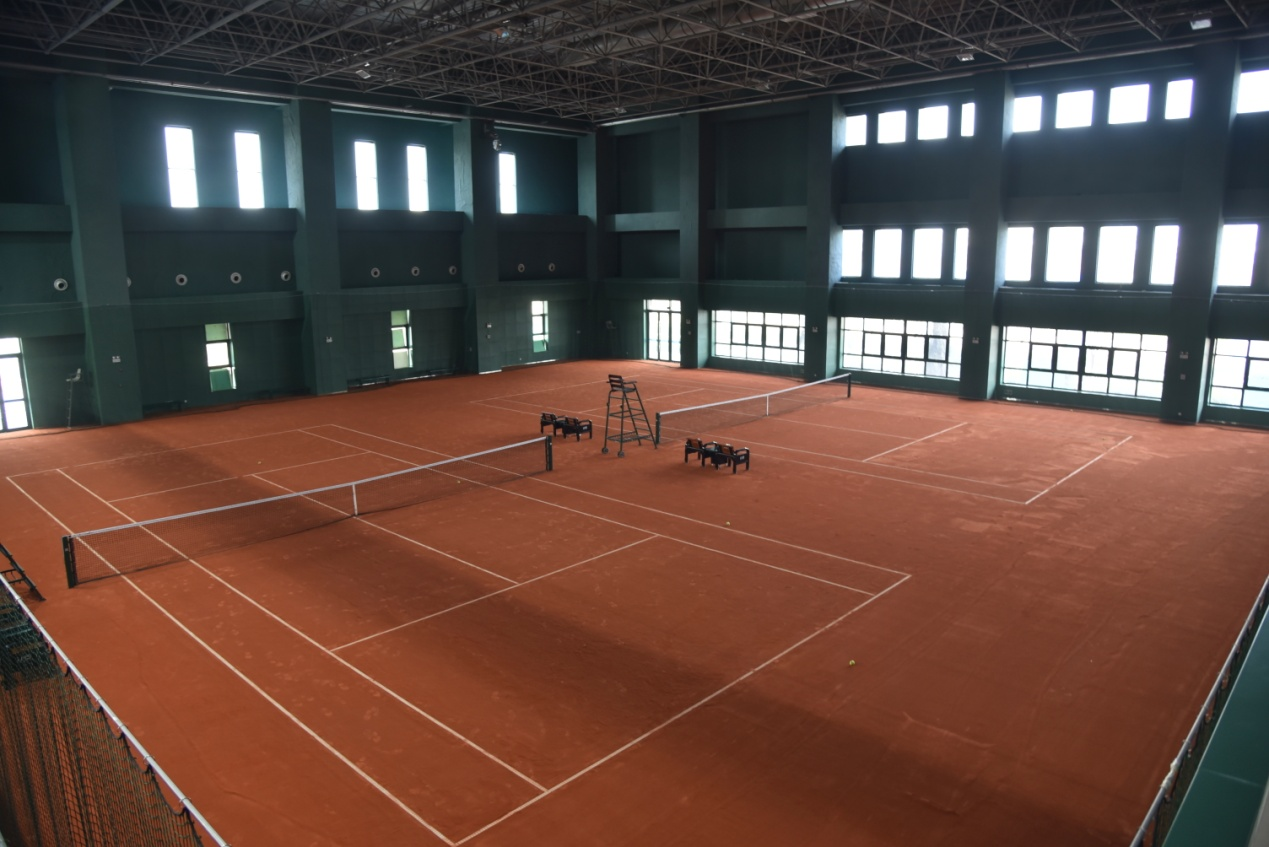网球馆建筑面积11516平方米,场地面积5978平方米,共8片标准场地,其中有6片塑胶场地、2片红土场地,馆内有良好的灯光照明、暖气、空调设备设施齐全,附属设施包括:贵宾室、淋浴室等,可承接各类网球项目比赛。